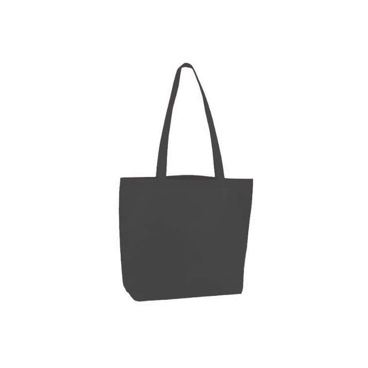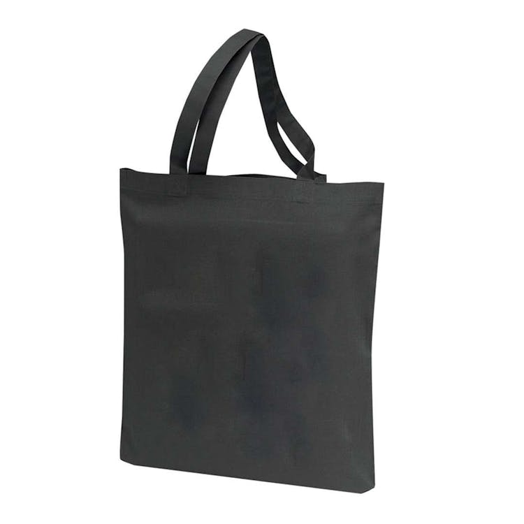 Durable 16-inch black cotton tote bag made from cotton twill. Features dual handles with a 9-inch drop and a roomy 15 x 16-inch size perfect for daily carry events or custom logo imprinting.